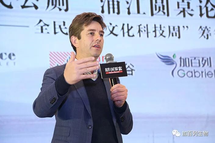 ▲左起加百列生物科技有限公司董事长/千人计划专家张冲、浦江县人民政府副县长于文统与胡润百富董事长兼首席调研员胡润签署战略合作协议