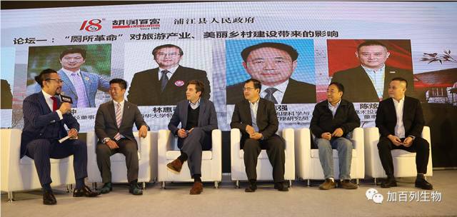 ▲论坛一 左起:吕能幸、加百列生物科技有限公司董事长/千人计划专家张冲、胡润、清华大学特聘教授兼日本厕所协会首位外籍会员林惠春、中国科学院地理科学与资源研究所客座研究员曹志强、中金嘉禾投资有限公司董事长陈炫名