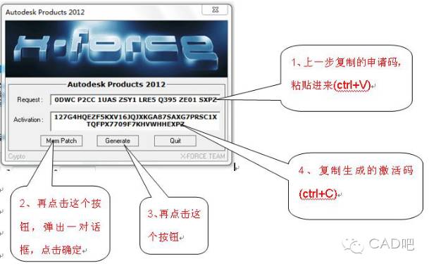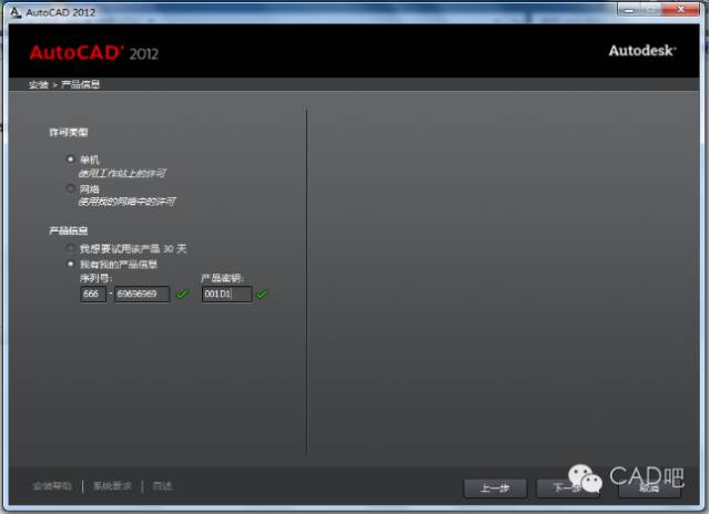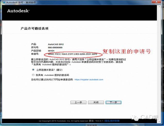 回到CAD激活界面的激活选项。选择我具有Autodesk提供的激活码选项。然后把你刚才复制的激活码粘贴到下面的文本框中即可。注:不用管你的激活码是否占满所有的文本框。只要粘贴进去就行了。点下一步按钮。