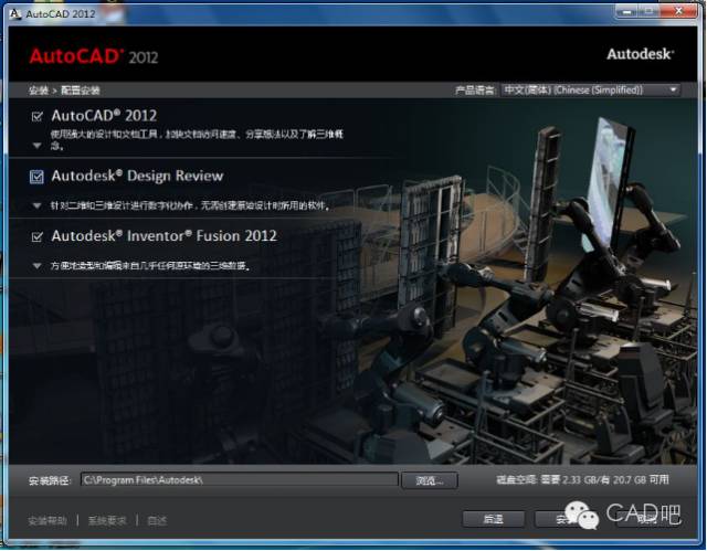 安装配置。安装CAD 2012除CAD 2012软件外,还包含了另外两种三维辅助设计软件。可以选择安装,也可不安,我选择了安装,下面还有安装的路径,使用它默认的即可。设置完成后点安装。