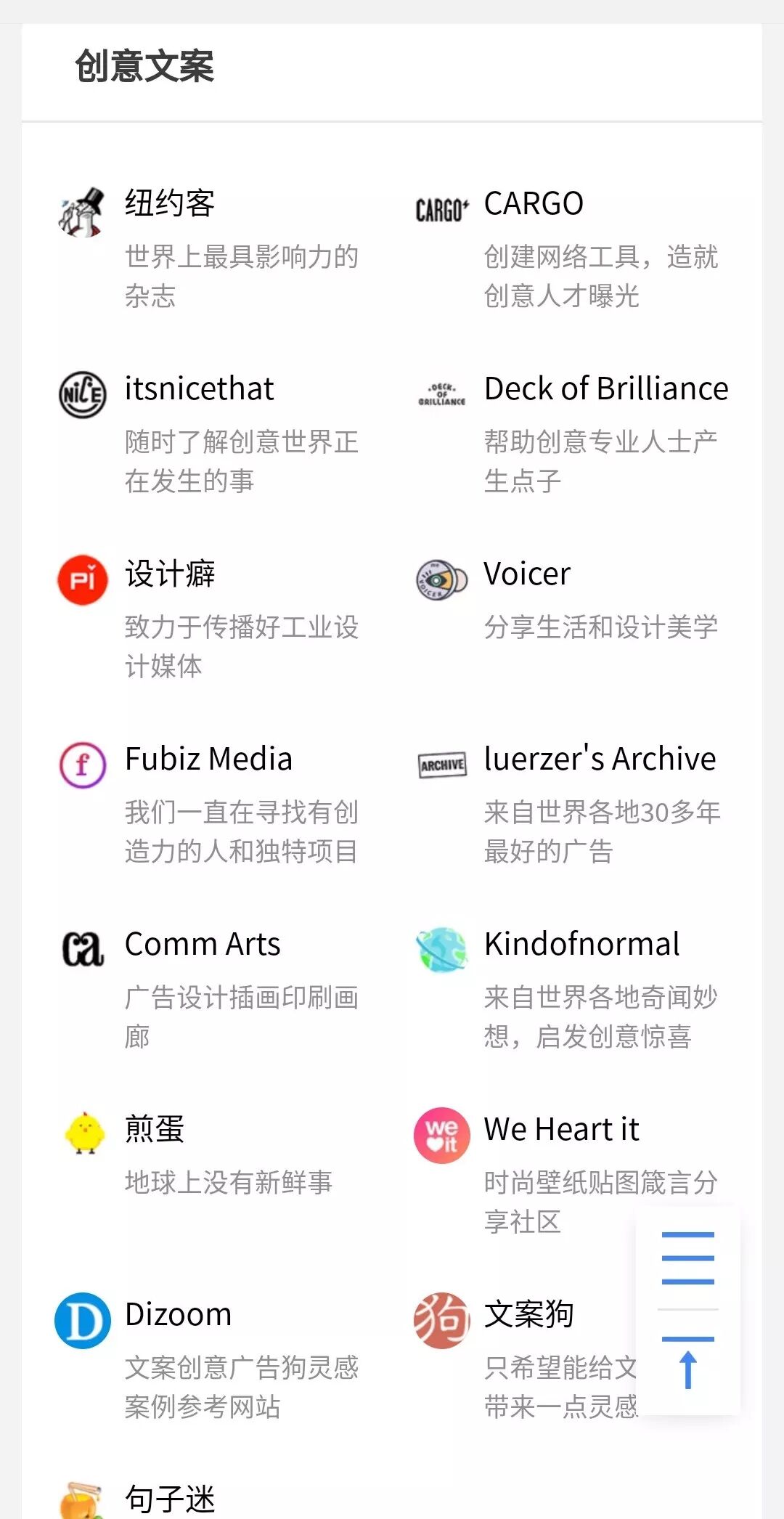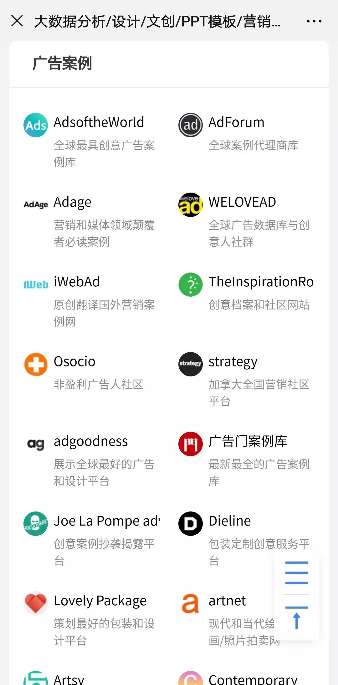 包含了19个分类栏目,涵盖 500多个网址,基本包含所有广告人日常所需。什么业内资讯、创意设计、经典案例库、创意文案、热搜榜、数据洞察、PPT模板、效率工具、创意热店等等应有尽有。