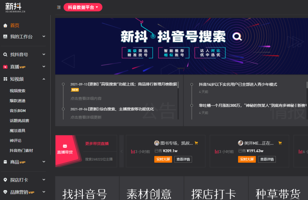 这个平台就不仅提供抖音热门视频、直播、爆款商品、优质账号、抖音话题挑战赛等抖音创意素材,你还可以查找抖音号及MCN机构排行、热门音乐BGM、神评论等。