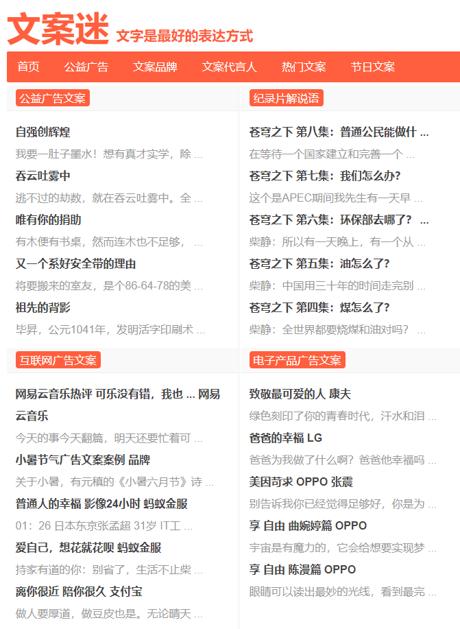 上面汇集了大量好的广告文案、广告语、广告词、公益文案、热门文案等等,应有尽有,对于懒人那绝对是效率神器。