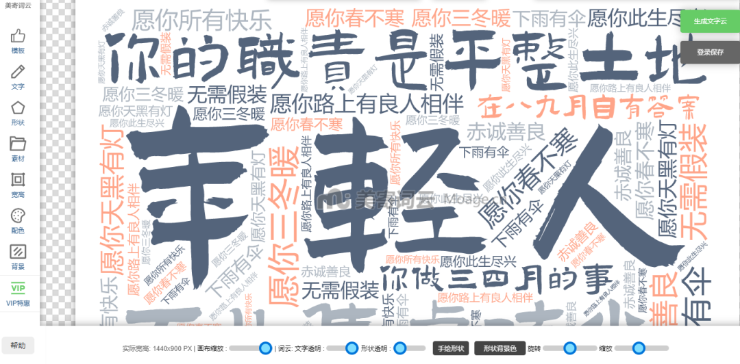 你只需要输入想要的词汇即可一键生成,同时也可以自定义字体样式、背景颜色、主图、文字云样式、大小等参数,效果很酷。