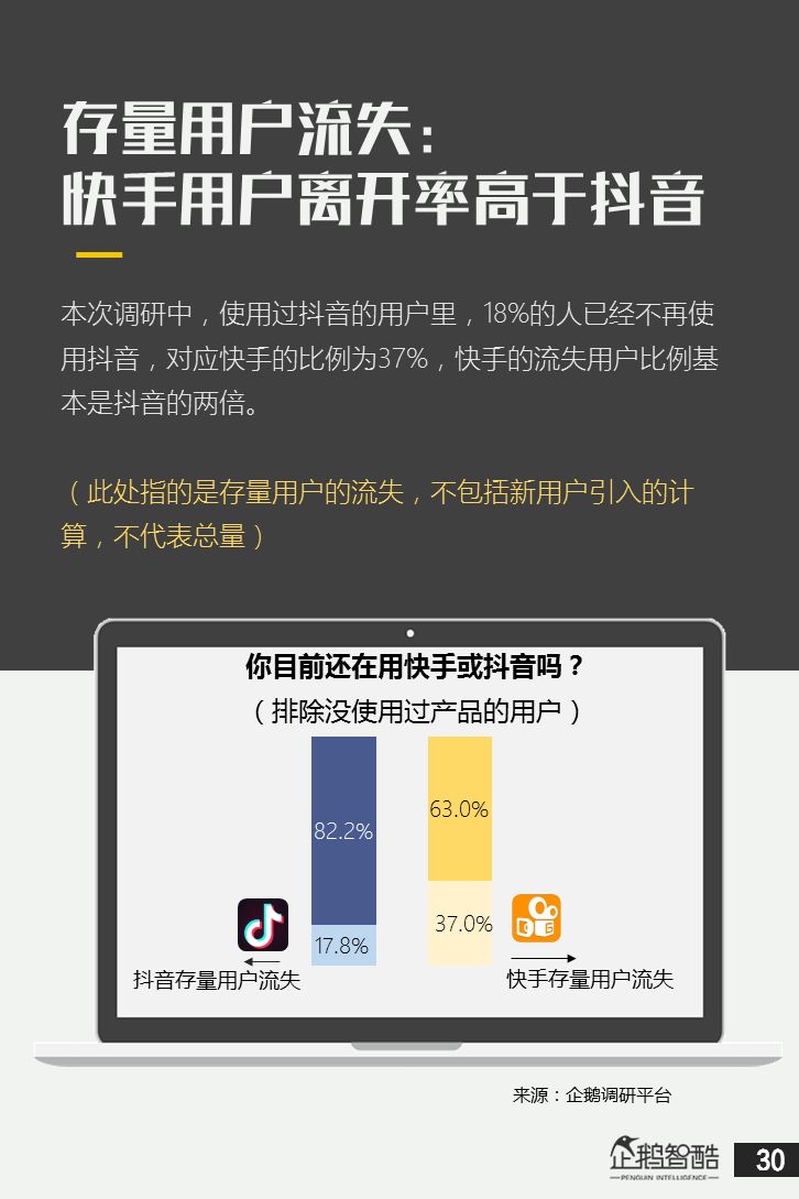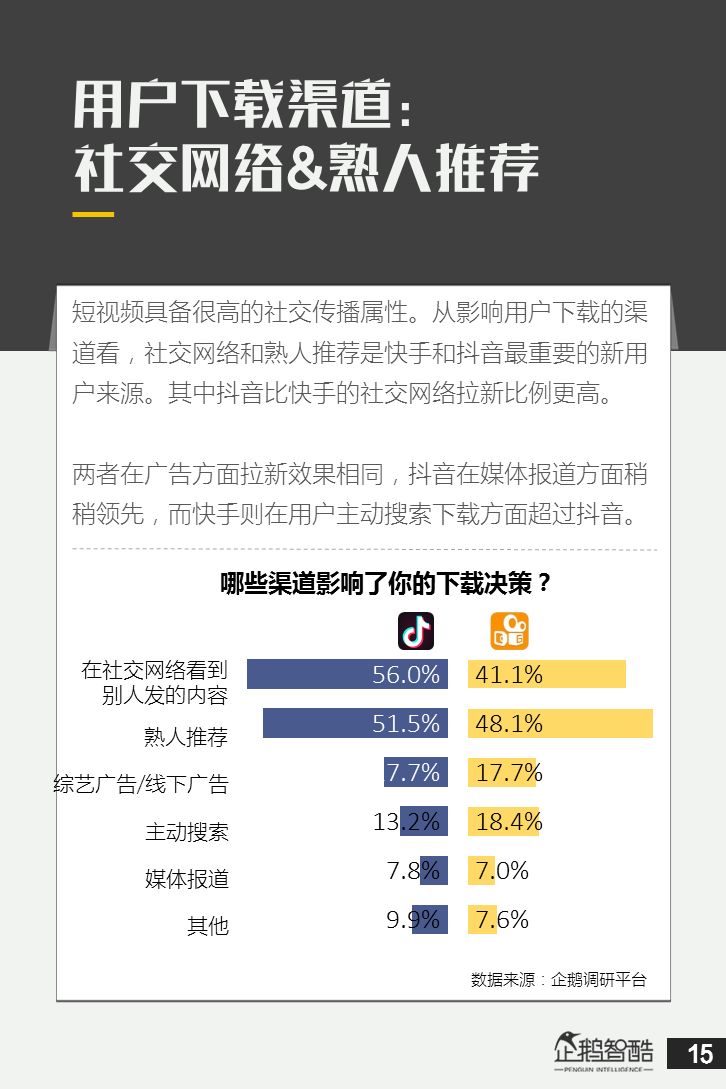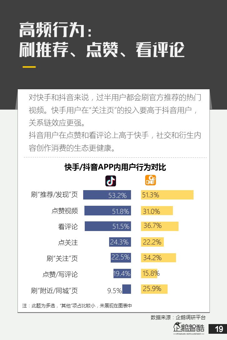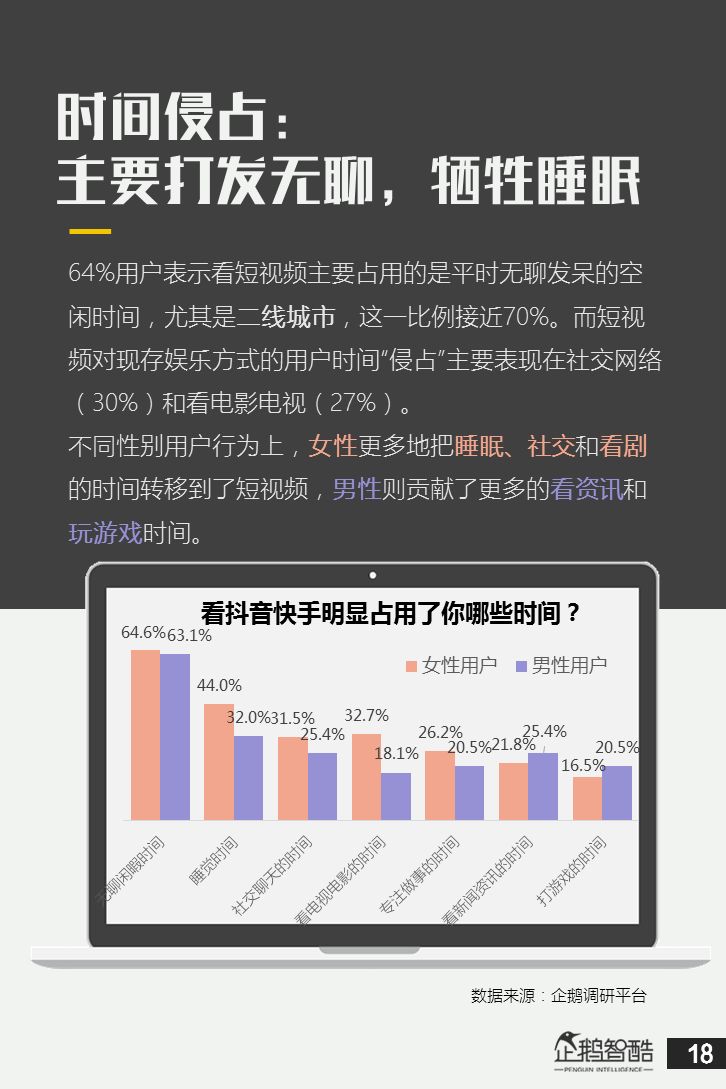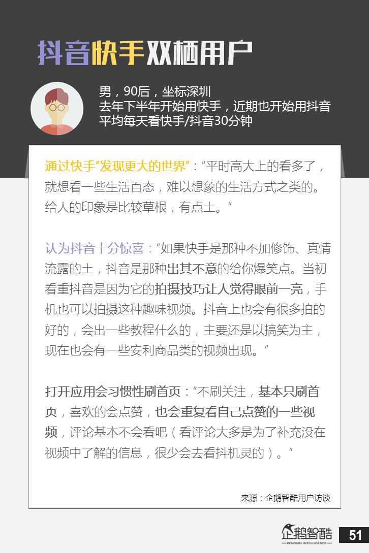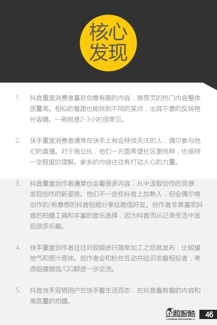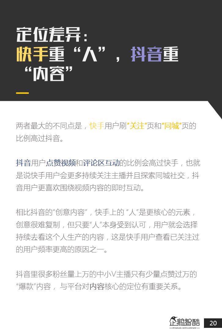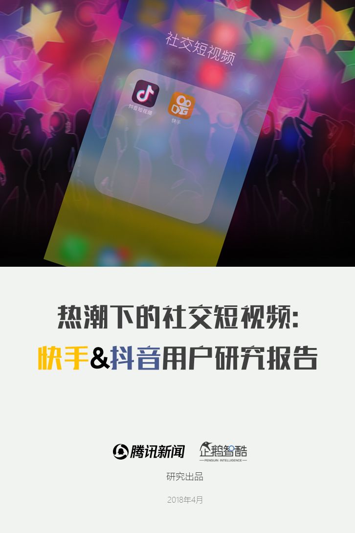 来源 / 企鹅智酷(ID:BizNext) 统筹 / 王冠 主创 / 冯辰 李紫薇 欢迎下载腾讯新闻客户端,关注科技页卡,查看更多科技热点新闻 在企鹅智酷2017年《分水岭》报告和同名图书里,我们提出了中国和全球移动互联网红利在最优市场触顶这一判断。于中国而言,移动互联网最优市场主要指我们所最熟悉的一线城市,20-35岁的互联网核心消费人群。 也正是从2017年开始,互联网下半场大幕打开,向三四线城市下沉成为获取用户红利的新趋势。在这一波浪潮里,先一步占据市场头部的社交短视频快手,和快速崛起的抖音,成为其中的代表性产品。 不论是南抖音,北快手,还是快手是小镇青年的,抖音是都市白领的,这些论述更多是来自于使用者对周围的感性判断——而对快手和抖音这两个月活用户数以亿计的产品而言,他们的用户到底分布在哪里,有着怎样的特征和偏好,我们期待通过数据和分析,给大家一个更完整的对比性研究。 为了更好地理解这个对中国移动互联网所有参与者而言都不可忽视的新市场和新红利,企鹅智酷旗下企鹅调研平台于2018年3月,对全国范围的网民进行了广泛调研,筛选出快手现有用户1080名,抖音现有用户1104名,两者重合现有用户630名,并结合QuestMobile的大数据监测,最终研究发布了这份《快手&抖音用户研究报告》。 在这份报告中,我们将重点从以下几个方面去解读这两款社交短视频产品的用户特征: 社交短视频行业速写 快手&抖音消费者分析 快手&抖音创作者分析 快手&抖音用户流动流失 快手&抖音重度用户特写 快手&抖音用户声音