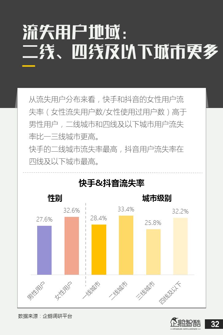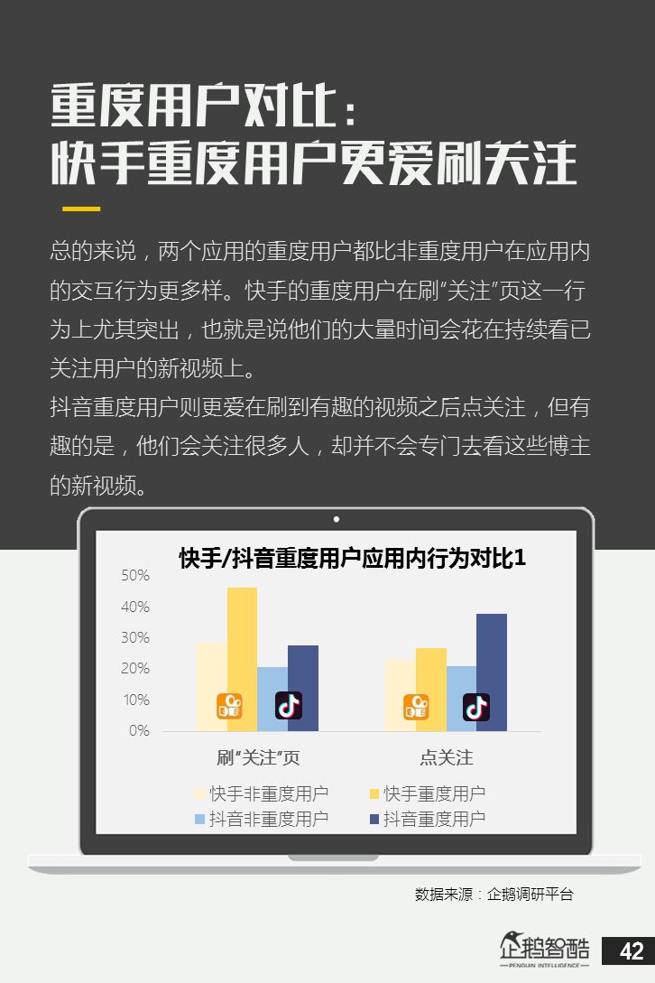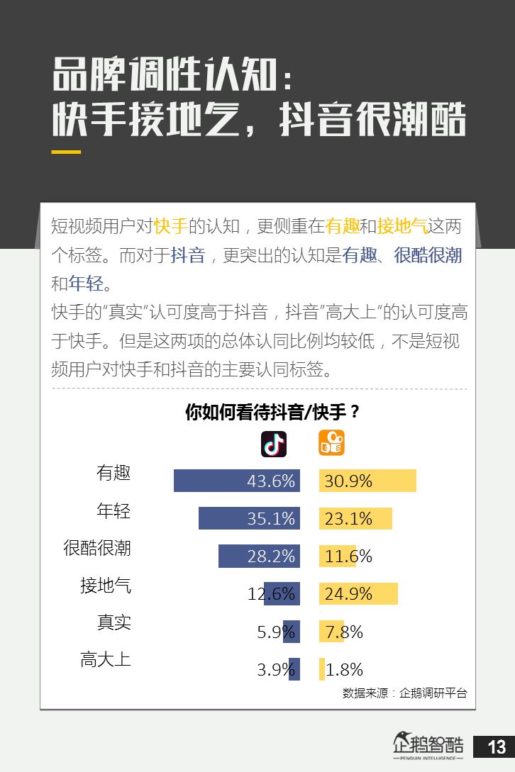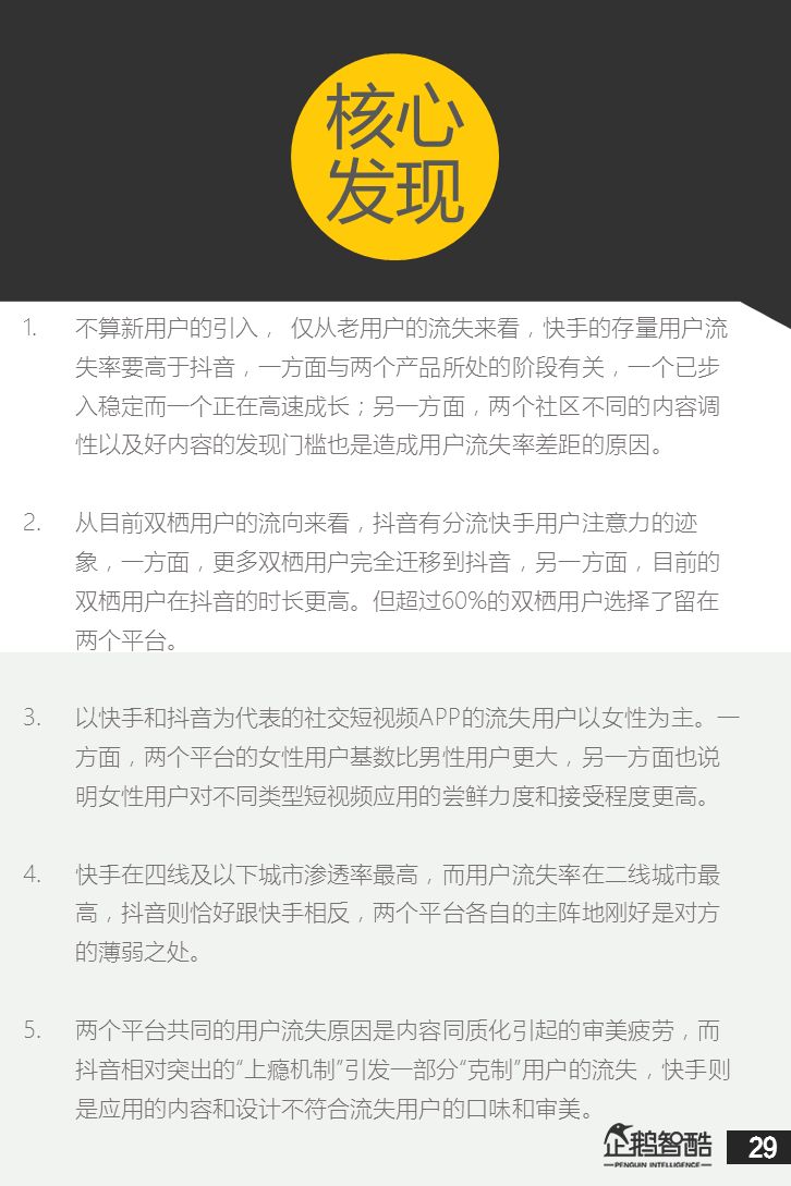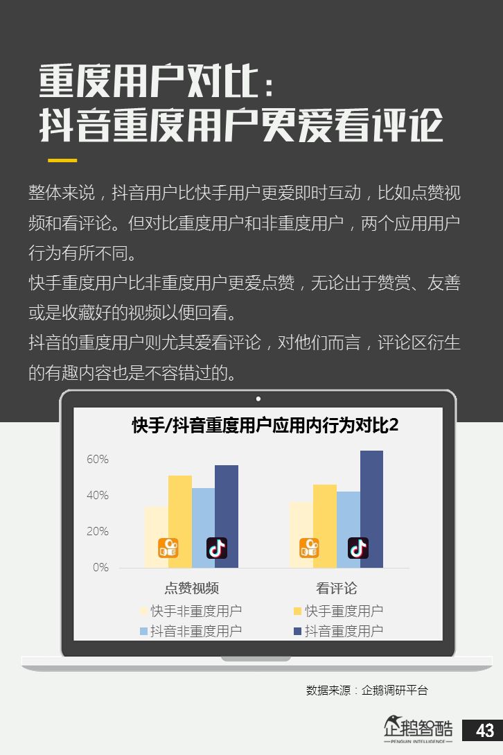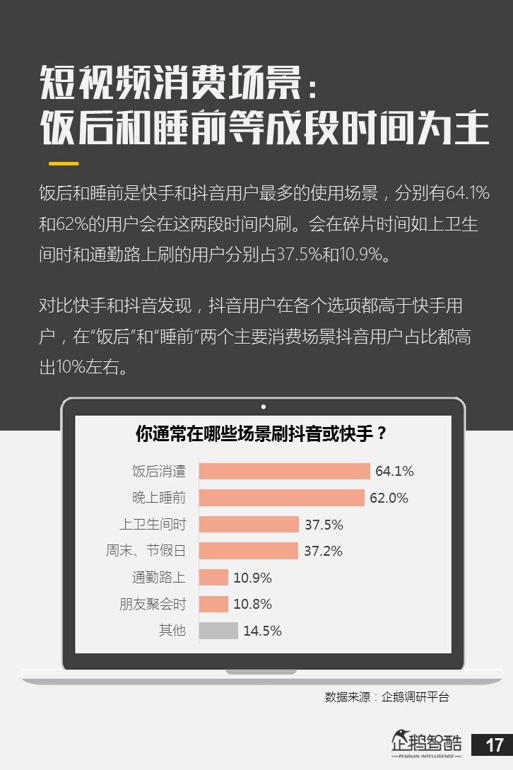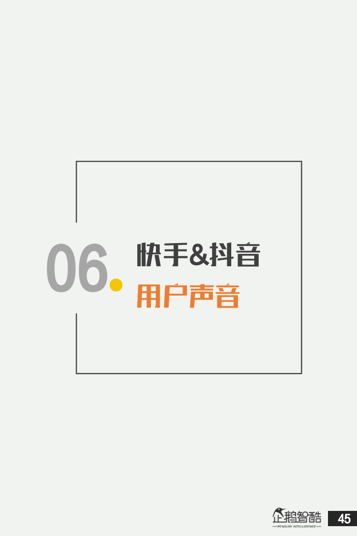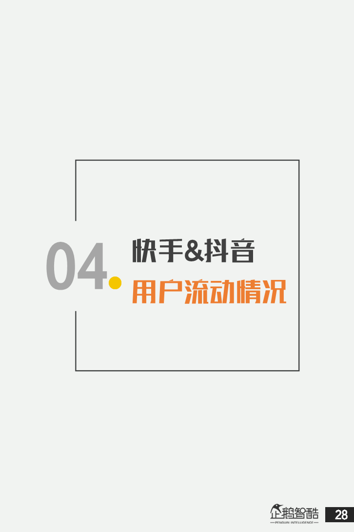 来源 / 企鹅智酷(ID:BizNext) 统筹 / 王冠 主创 / 冯辰 李紫薇 欢迎下载腾讯新闻客户端,关注科技页卡,查看更多科技热点新闻 在企鹅智酷2017年《分水岭》报告和同名图书里,我们提出了中国和全球移动互联网红利在最优市场触顶这一判断。于中国而言,移动互联网最优市场主要指我们所最熟悉的一线城市,20-35岁的互联网核心消费人群。 也正是从2017年开始,互联网下半场大幕打开,向三四线城市下沉成为获取用户红利的新趋势。在这一波浪潮里,先一步占据市场头部的社交短视频快手,和快速崛起的抖音,成为其中的代表性产品。 不论是南抖音,北快手,还是快手是小镇青年的,抖音是都市白领的,这些论述更多是来自于使用者对周围的感性判断——而对快手和抖音这两个月活用户数以亿计的产品而言,他们的用户到底分布在哪里,有着怎样的特征和偏好,我们期待通过数据和分析,给大家一个更完整的对比性研究。 为了更好地理解这个对中国移动互联网所有参与者而言都不可忽视的新市场和新红利,企鹅智酷旗下企鹅调研平台于2018年3月,对全国范围的网民进行了广泛调研,筛选出快手现有用户1080名,抖音现有用户1104名,两者重合现有用户630名,并结合QuestMobile的大数据监测,最终研究发布了这份《快手&抖音用户研究报告》。 在这份报告中,我们将重点从以下几个方面去解读这两款社交短视频产品的用户特征: 社交短视频行业速写 快手&抖音消费者分析 快手&抖音创作者分析 快手&抖音用户流动流失 快手&抖音重度用户特写 快手&抖音用户声音