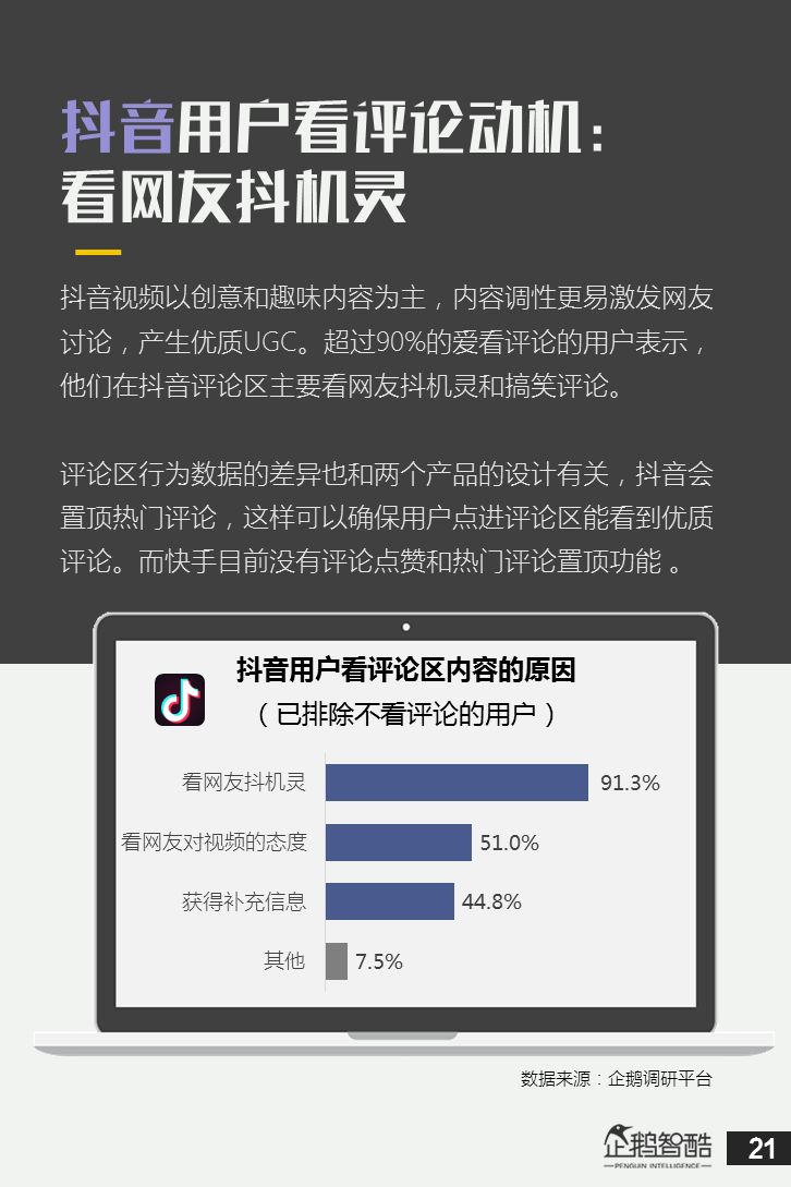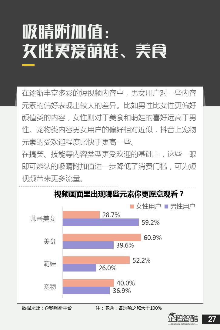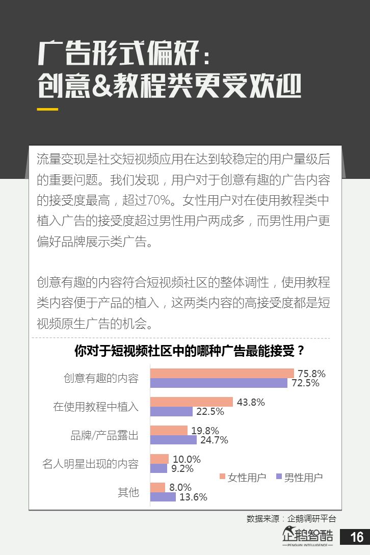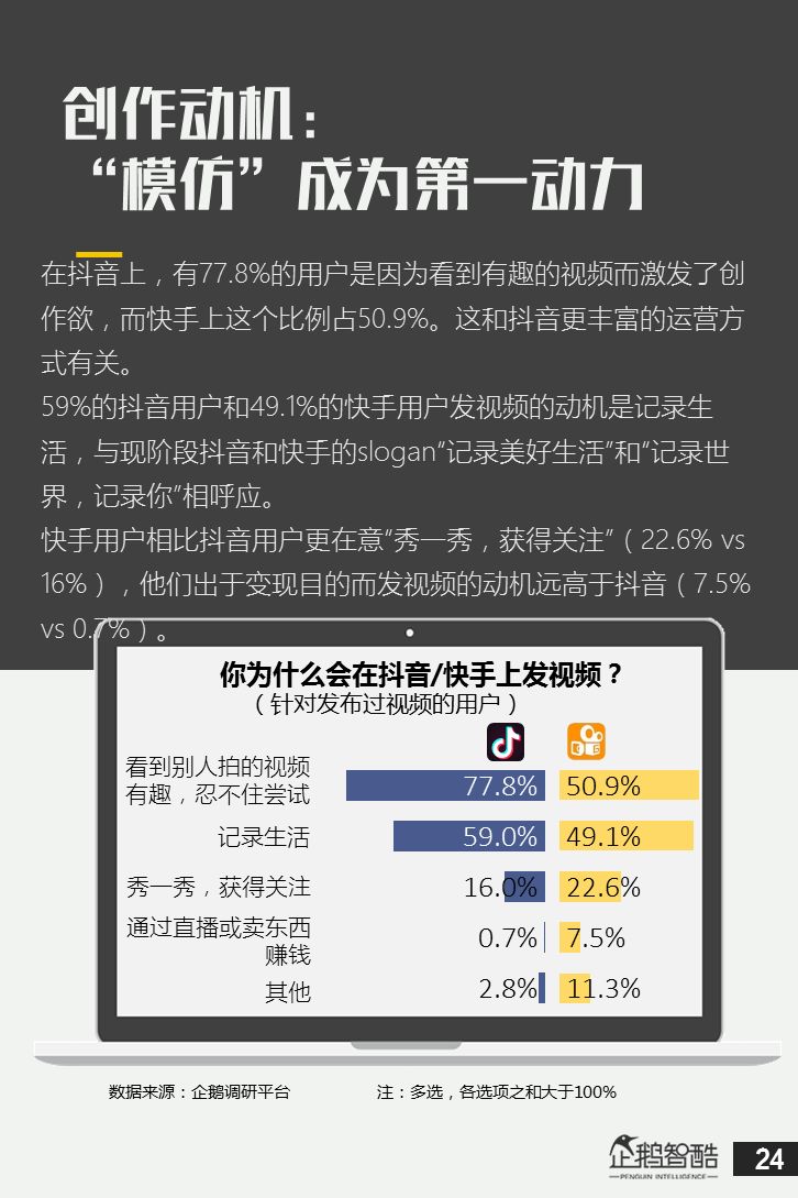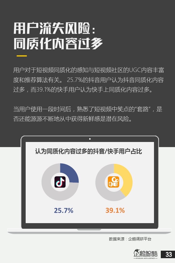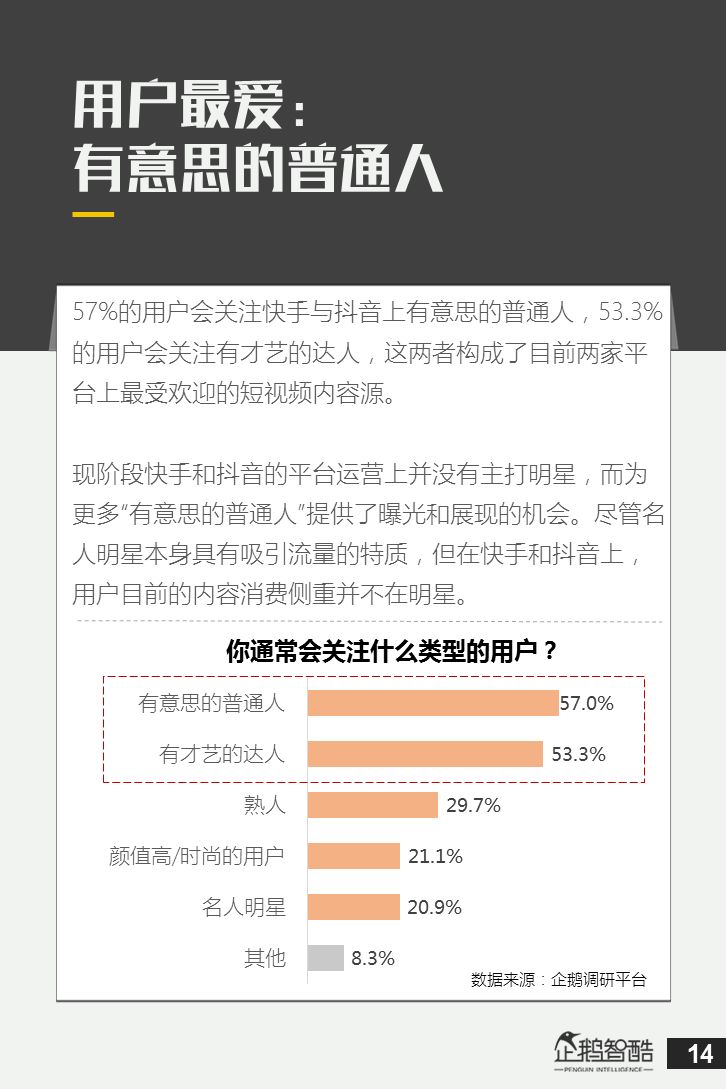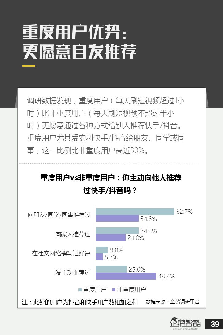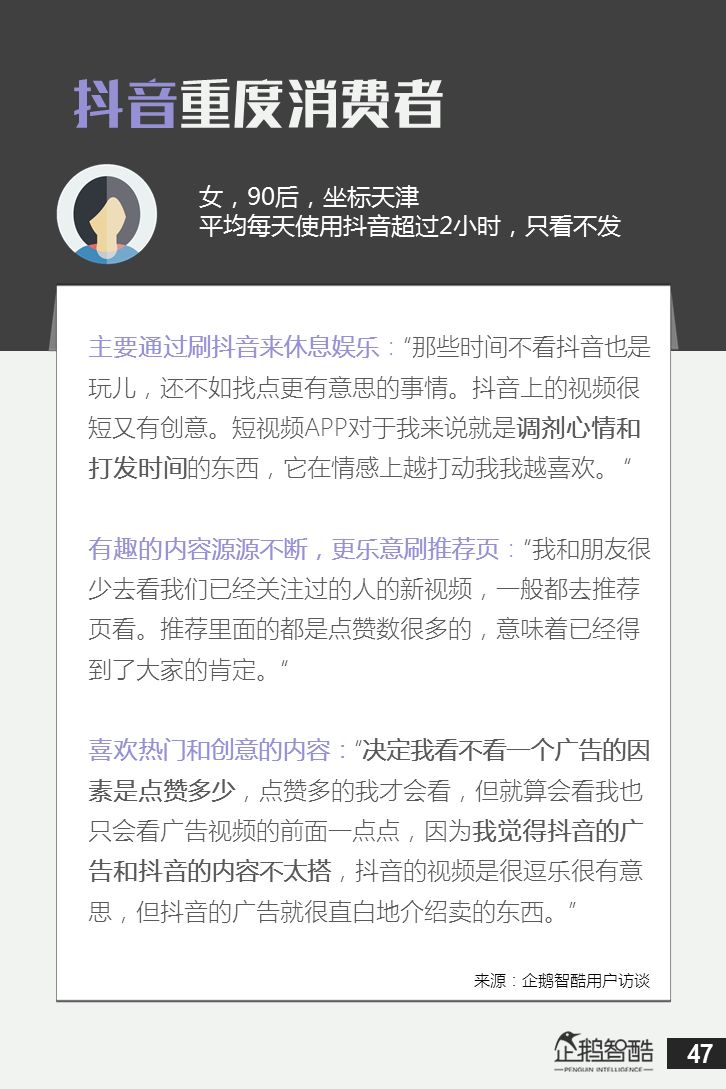 来源 / 企鹅智酷(ID:BizNext) 统筹 / 王冠 主创 / 冯辰 李紫薇 欢迎下载腾讯新闻客户端,关注科技页卡,查看更多科技热点新闻 在企鹅智酷2017年《分水岭》报告和同名图书里,我们提出了中国和全球移动互联网红利在最优市场触顶这一判断。于中国而言,移动互联网最优市场主要指我们所最熟悉的一线城市,20-35岁的互联网核心消费人群。 也正是从2017年开始,互联网下半场大幕打开,向三四线城市下沉成为获取用户红利的新趋势。在这一波浪潮里,先一步占据市场头部的社交短视频快手,和快速崛起的抖音,成为其中的代表性产品。 不论是南抖音,北快手,还是快手是小镇青年的,抖音是都市白领的,这些论述更多是来自于使用者对周围的感性判断——而对快手和抖音这两个月活用户数以亿计的产品而言,他们的用户到底分布在哪里,有着怎样的特征和偏好,我们期待通过数据和分析,给大家一个更完整的对比性研究。 为了更好地理解这个对中国移动互联网所有参与者而言都不可忽视的新市场和新红利,企鹅智酷旗下企鹅调研平台于2018年3月,对全国范围的网民进行了广泛调研,筛选出快手现有用户1080名,抖音现有用户1104名,两者重合现有用户630名,并结合QuestMobile的大数据监测,最终研究发布了这份《快手&抖音用户研究报告》。 在这份报告中,我们将重点从以下几个方面去解读这两款社交短视频产品的用户特征: 社交短视频行业速写 快手&抖音消费者分析 快手&抖音创作者分析 快手&抖音用户流动流失 快手&抖音重度用户特写 快手&抖音用户声音