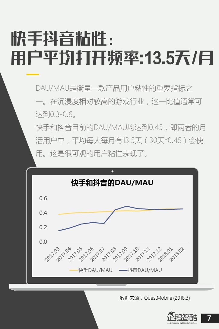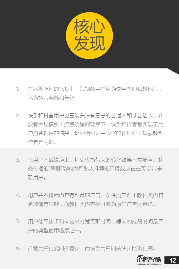 1、社交短视频市场的初步格局已经形成,但未来变数仍旧很大。从数据看,快手始终保持稳固领先和增长趋势; 2、抖音在过去三个月里取得了突破性增长,增速远超行业竞品。未来抖音有望进一步拉近与快手之间的用户数差距,但春节之后继续保持超高速增长需要更新的动力; 3、快手和抖音在用户粘性方面(DAU/MAU)方面表现出色且趋同,在用户的消费广泛度和时长上,抖音高于快手; 4、快手和抖音的重合用户占比呈现相反趋势,抖音获取了更多非快手新用户或者离开快手的用户。这对抖音来说是一种利好; 5、抖音在女性用户,年轻用户,高收入高学历用户,和一二线城市用户占比上高于快手,但并未形成明显的用户画像对立。两者的主要用户粮仓依然在非一线城市; 6、在品牌调性的认知上,短视频用户认为快手有趣和接地气,认为抖音潮酷和年轻; 7、快手和抖音用户更喜欢关注有意思的普通人和才艺达人,在没有大规模引入流量明星的背景下,快手和抖音都实现了用户消费粘性的构建,这种相对去中心化的社区对于短视频创作者是利好; 8、在用户下载渠道上,社交传播带来的转化效果非常显着。社交传播的刷屏影响力和熟人推荐的口碑效应往往可以带来新用户; 9、用户并不排斥内容有创意的广告。女性用户对于教程类内容更加情有独钟,而教程类内容很可能为原生广告所青睐; 10、用户使用快手和抖音来打发无聊时间,睡前的成段时间是用户的典型使用场景之一; …… 以下为报告全文:
