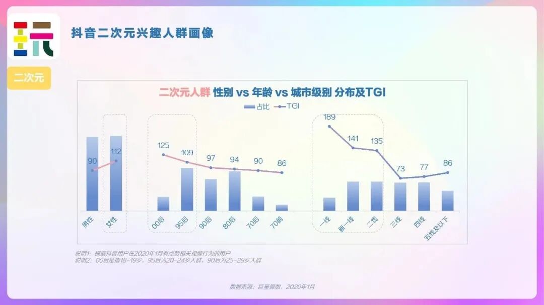 抖音二次元兴趣人群画像在不同城市级别的分布则平均许多,新一线、二线、三线、四线城市的分布情况十分接近。但值得注意的是,不同城市级别对二次元的偏度度与游戏正好相反,一线、新一线及二线城市明显较三线及以下城市对二次元类别的视频更感兴趣。