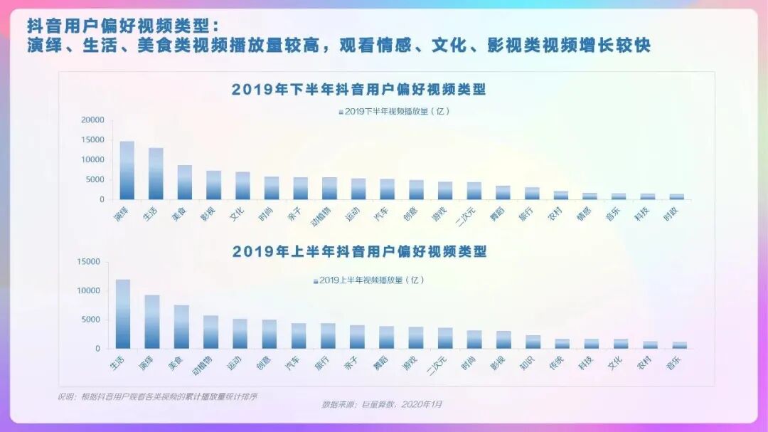 随着抖音生态日趋成熟,用户偏好的视频也在悄然变化,情感、文化、影视类视频出现了较快增长,游戏和二次元类增长稳定,演绎、生活、美食继续稳居前三甲。