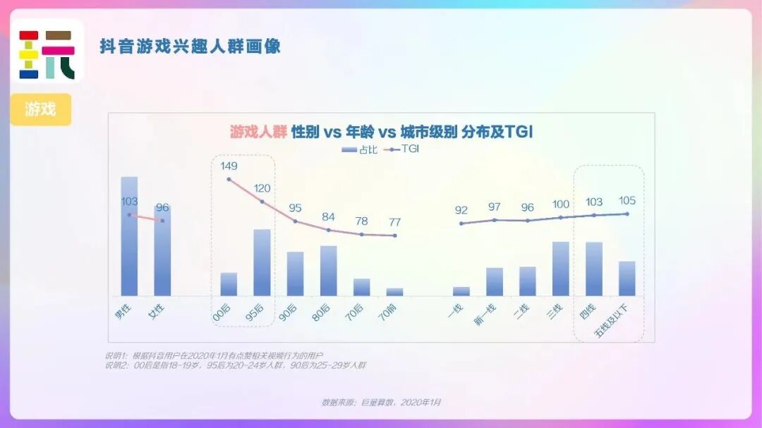 从抖音游戏兴趣人群的用户画像来看,95后和80后占比最高,但从偏好度的角度来看年纪越轻的用户对游戏越感兴趣。此外,三线及四线城市在游戏兴趣人群中占比最高,四线、五线及以下城市对游戏的偏好度较高。