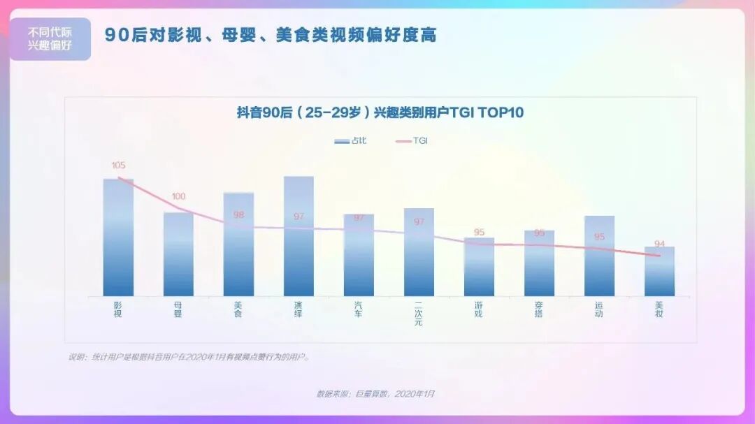 与此同时,年轻、活力依然是抖音的主旋律。数据显示,19至40岁的用户占到了抖音总用户数量的72%;90后、00后人群占比达43%,且该群体对抖音表现除了较为明显的偏好。