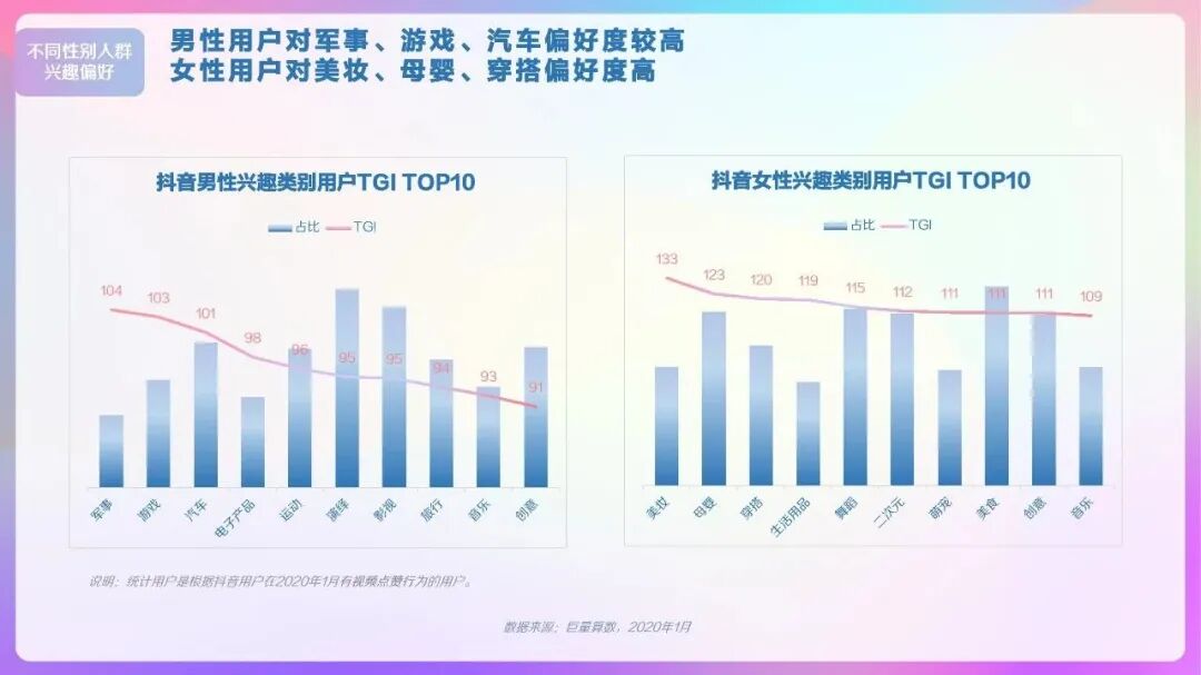 从性别来看,男性用户对游戏类视频的偏好度在所有类别中位居第二,仅次于军事;女性用户对二次元类视频的偏好度在所有类别中位居第六。