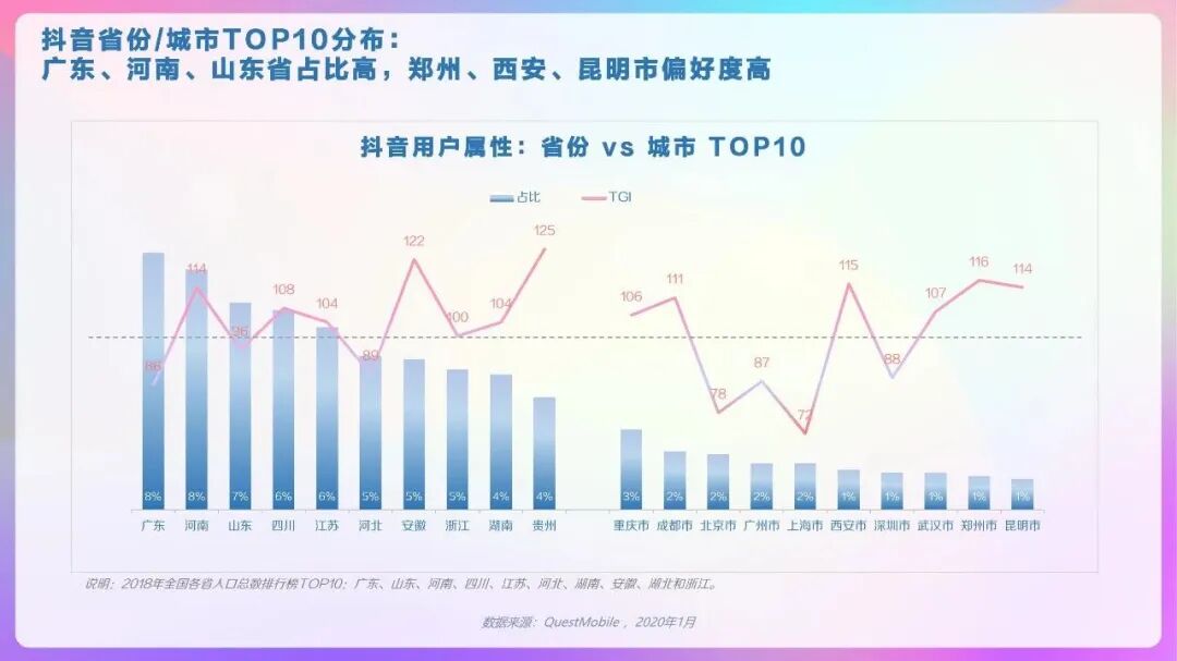 用户分布方面,新一线城市、三线及四线城市占比分别为17%、25%和22%,来自广东、河南、山东用户占比分列前三。具体到城市,重庆、成都两座西南城市异军突起,名列第一和第二,传统一线城市北上广紧随其后,深圳稍有落后,排名第七。