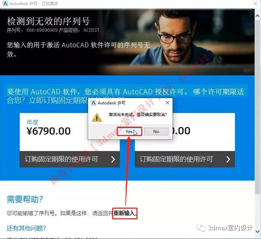 9、此时会出现提示你输入的序列号有误,没关系,这是一个正常的步骤,先点击后退点击提示框中的是
