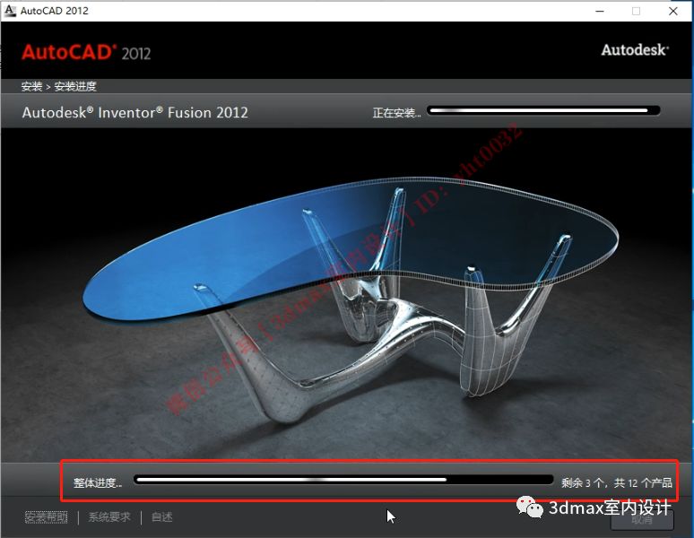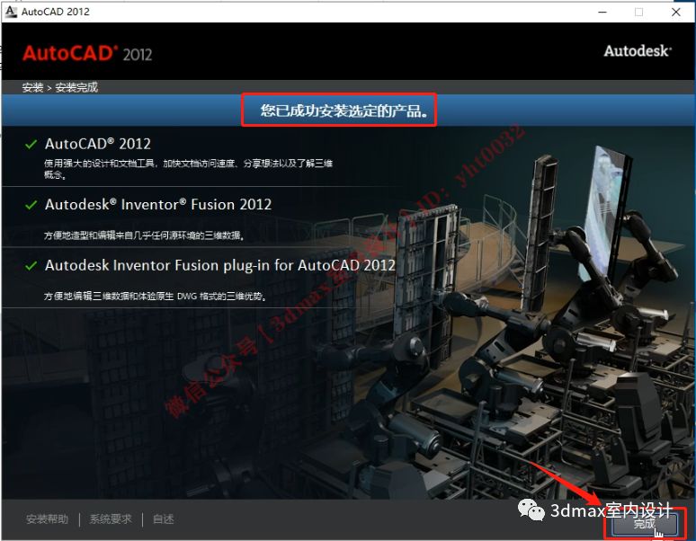 6、整个AutoCAD2012的安装程序有12个产品,安装大约需要10分钟左右,耐心等待期安装完成会有提示您已成功安装选定产品,然后点击完成;