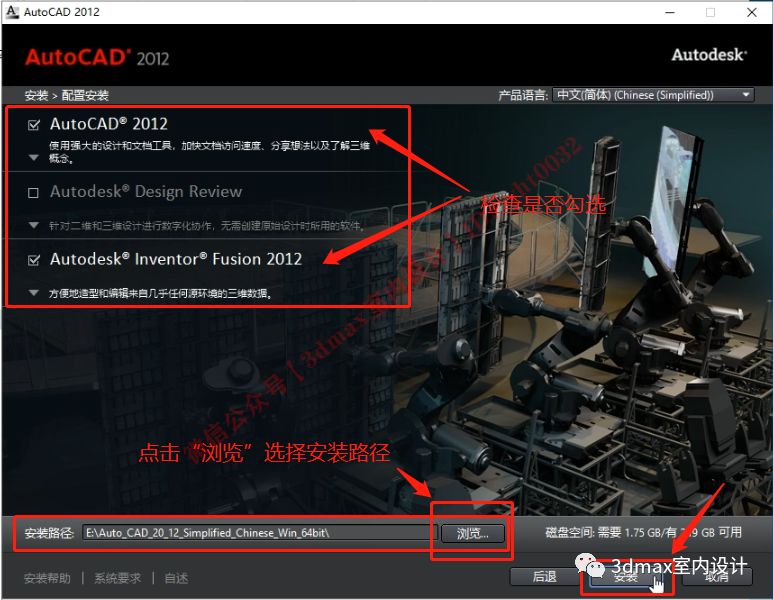 5、根据下图指示,选择检查是否勾选其中两项,然后再点击浏览配置安装路径(安装到解压CAD的文件夹即可,切勿安装C盘系统盘哦,否则电脑会卡爆的),然后点击安装