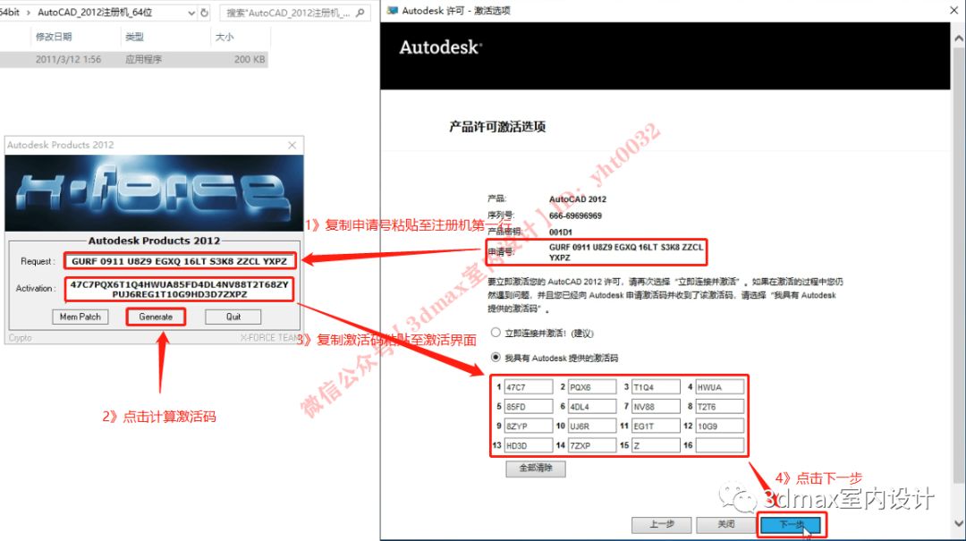 14、现在正式开始计算激活码: 1)复制激活界面申请号,粘贴至注册机第一行(记得把注册机第一行的英文删除); 2)点击注册机中下方按钮Generate计算激活码; 3)全选复制激活码,粘贴至激活界面; 4)点击下一步激活软件; 复制粘贴的时候用键盘快捷键,复制:Ctrl+C,粘贴:Ctrl+V;