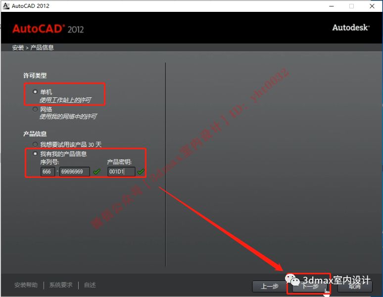 4、许可类型选择单击输入序列号666-69696969,密钥:001D1,然后点击下一步