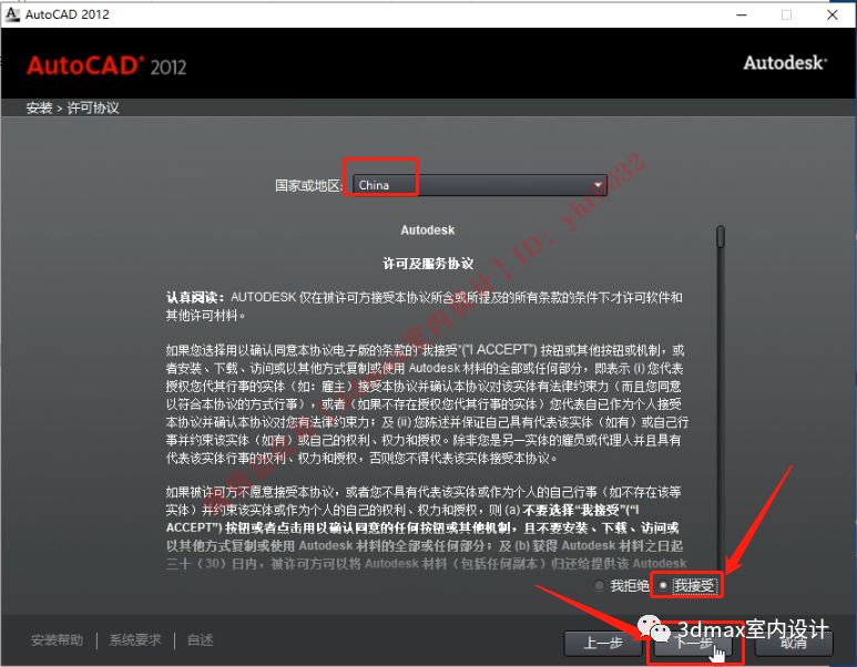 3、现在进入到CAD2012的许可协议界面,点击我接受再点击下一步