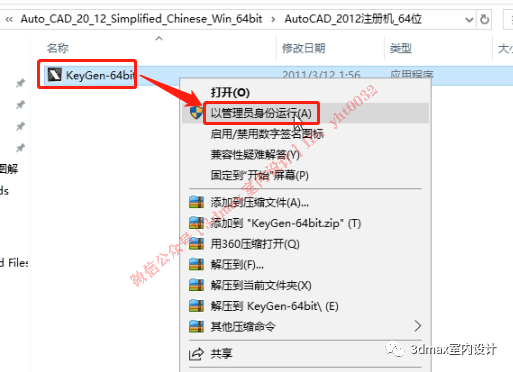 12、回到起初解压软件的文件夹内找到AutoCAD2012的注册机文件夹双击进入,找到注册机,打开注册机的方式是鼠标右键单击,选择以管理员身份运行