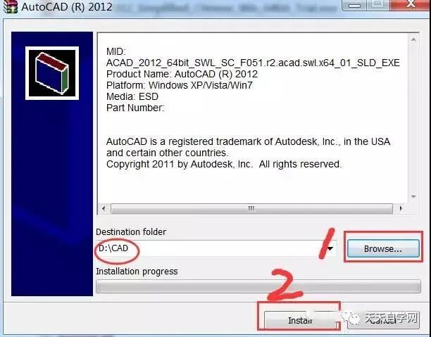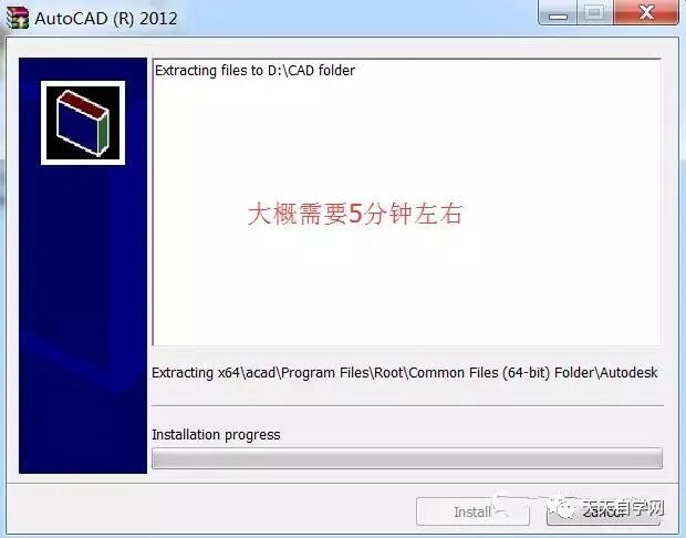 3.点击Browse选择解压目标文件夹,可在D盘或其它盘里面新建一个CAD文件夹,然后点击Install(大概需要5分钟左右)。