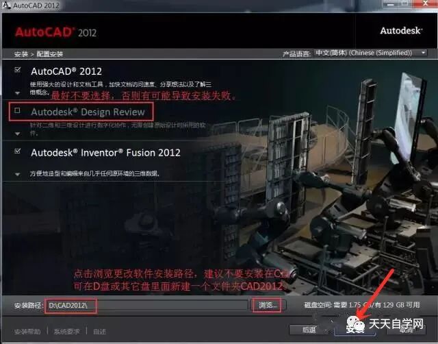 7.关于第二项Autodesk Design可以选择安装,也可以不选,最好不要选择,否则有可能导致最后安装失败。点击浏览更改软件安装路径:建议安装到除C盘以外的磁盘,可在D盘或其它盘里面新建一个文件夹CAD2012。点击安装。
