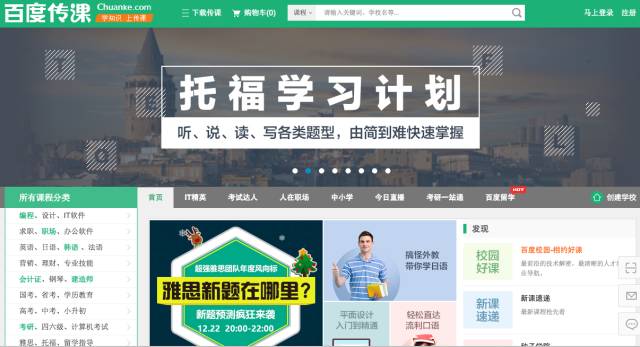 5、百度传课 百度传课引入全国知名重点学校的一线教学名师,采取网络互动直播和点播的授课模式,为广大的学生群体提供高效便捷的网络精品课程。