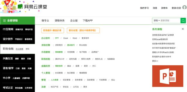 4、网易云课堂 网易云课堂,是在线实用技能学习平台,涵盖实用软件、IT与互联网、外语学习、生活家居、兴趣爱好、职场技能、金融管理、考试认证、中小学、亲子教育等十余大门类。