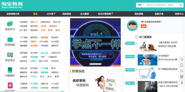 7、淘宝教育 淘宝教育精品课程,提供电子商务、公务员、考研、英语、小语种、口语外教、雅思托福、学历教育、考试认证、文体艺术、中小学辅导、亲子早教、生活百科、电脑IT、财务金融、营销管理、职业技能等精品课程培训学习。