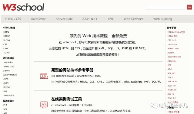 非常实用的视频教程网站,小编已经不止推荐过一次了,虽然网站界面设计的比较传统,但内容非常丰富,包含Word、Excel、PPT等基础应用教程,也有PR、AE、CAD等专业软件的视频教程。除了资源丰富,关键还免费,谁用谁知道。如果你正在学习某款软件,发愁找不到教学视频,那就赶快上去搜一搜吧! 2、W3school:http://www.w3school.com.cn/