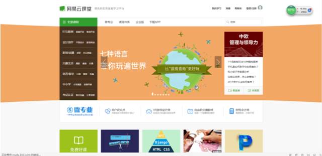 4、网易云课堂 网易云课堂,是在线实用技能学习平台,涵盖实用软件、IT与互联网、外语学习、生活家居、兴趣爱好、职场技能、金融管理、考试认证、中小学、亲子教育等十余大门类。