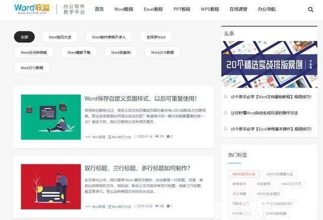 在这个学习网站,你能学到很多和Word相关的知识。点击其中的【Word教程】,便能看到很多不错的Word课程了,比如如何保存自定义的页眉样式,如何制作双行标题等等。直接点击自己想要学习的内容,就能看到详细的图文教程了。